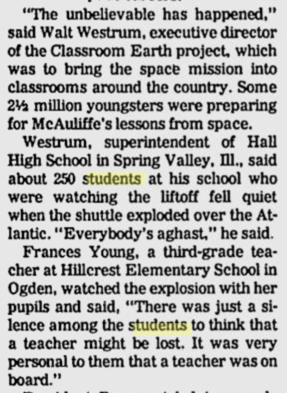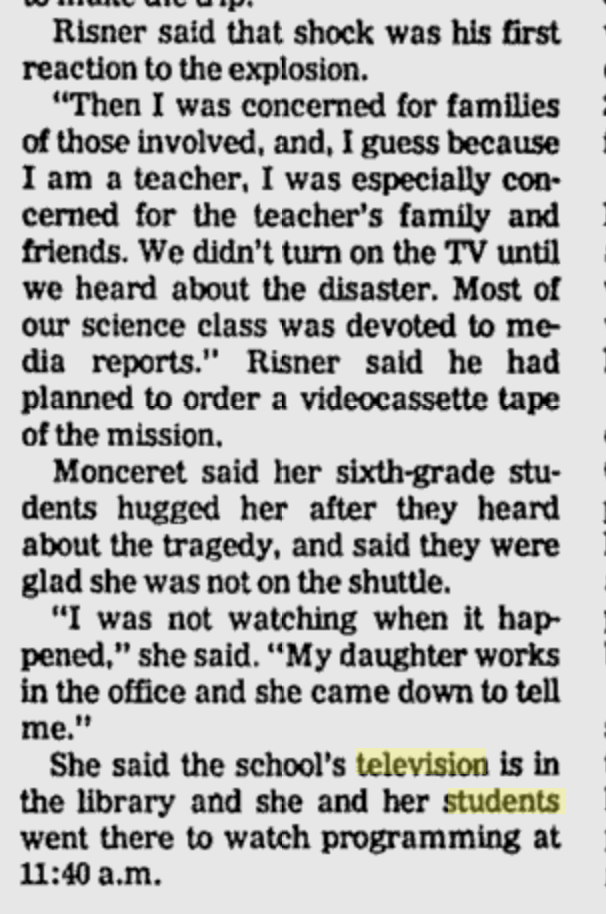 One article interviewed multiple teachers who had applied for the teacher program or expected to take part in McAuliffe's lessons from the shuttle. Two teachers turned on the TV afterward, one going to a TV in the school library. A superintendent at another school describes a group of 250 students watching (enrollment at their high school today and 10 years ago was a bit over 400, so this was likely the majority of students, but not every student).